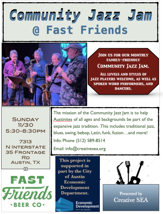 The Community Jazz Jam carries on the friendly all-ages jam that Paul hosted at Kickbutt Coffee from 2011-2020. The philosophy of this jam was to make jazz accessible to all levels and styles of music performers who wanted to explore the jazz tradition. This approach made the jam popular with a wide cross-section of Austin’s music community. As the Community Jazz Jam builds back up, CreativeSEA’s sponsorship will encourage multi-media artistic social engagement, so that folks with various creative tools can connect with the music across different media. For example, live drawing at concerts is an increasingly common multi-media activity. Digital photography (especially with today’s smart phones) is ubiquitous at most music events. And spoken word has long been part of jazz performances. These are just a few examples of multi-media creative expressions which are historically part of the jazz tradition, and hopefully will become an organic part of the Community Jazz Jam.