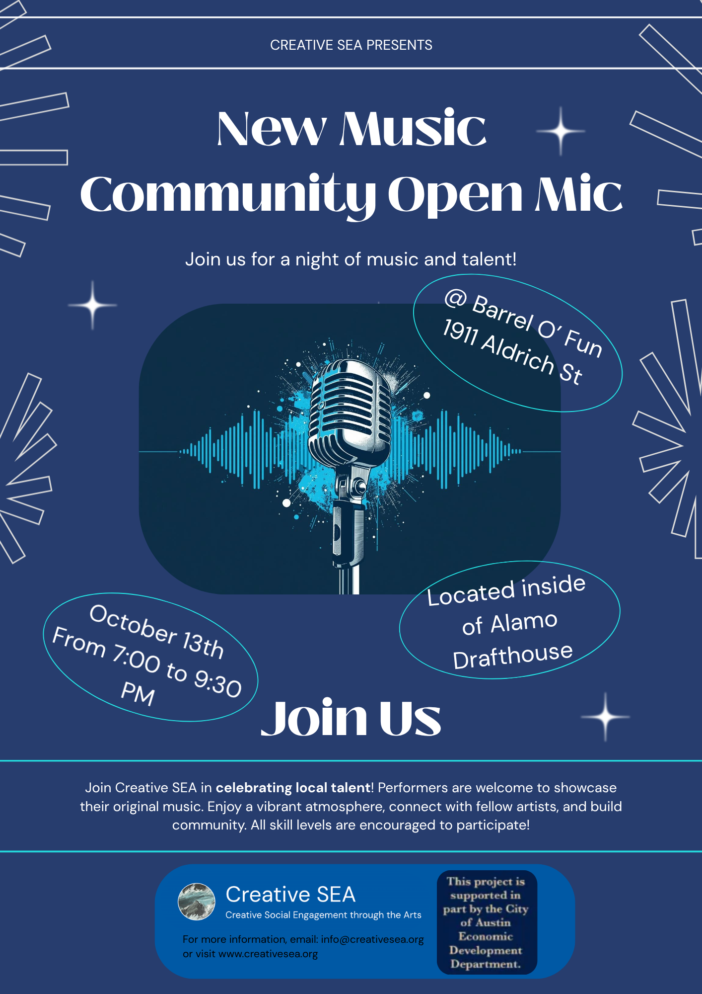 The Community Jazz Jam carries on the friendly all-ages jam that Paul hosted at Kickbutt Coffee from 2011-2020. The philosophy of this jam was to make jazz accessible to all levels and styles of music performers who wanted to explore the jazz tradition. This approach made the jam popular with a wide cross-section of Austin’s music community. As the Community Jazz Jam builds back up, CreativeSEA’s sponsorship will encourage multi-media artistic social engagement, so that folks with various creative tools can connect with the music across different media. For example, live drawing at concerts is an increasingly common multi-media activity. Digital photography (especially with today’s smart phones) is ubiquitous at most music events. And spoken word has long been part of jazz performances. These are just a few examples of multi-media creative expressions which are historically part of the jazz tradition, and hopefully will become an organic part of the Community Jazz Jam.